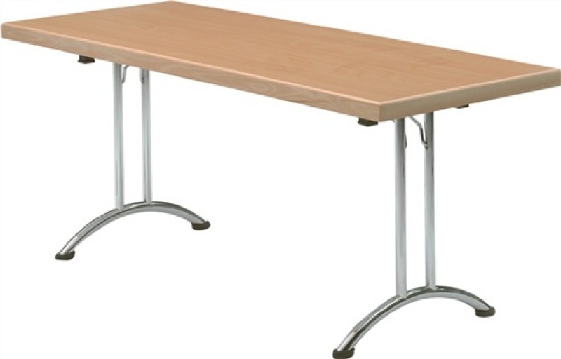 mit gebogenen Tischkufen · Doppel-T-Stahlrohrgestell verchromt, Ø 32 mm · Spezial-Klappbeschlag · Kunststoff-Distanzhalter für Stapelung · Gütespanplatte melaminharzbeschichtet, 20 mm stark · Buchedekor · 65-mm-Tischkante aus Buche massiv, natur lackiert · Tischhöhe 725 mm · Tischkufen mit höhenverstellbaren Bodengleitern